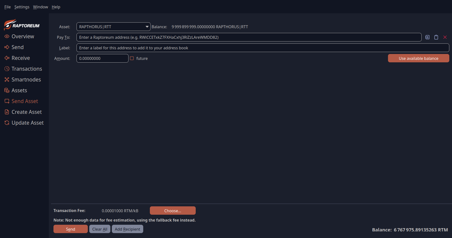 In this menu, you can send your assets, provided they are available in your wallet and you have some RTM (Real-Time Tokens) in your wallet as a fee.